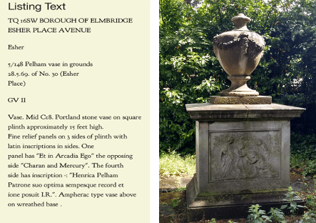The Pelham Urn was seemingly discarded as something of insignificance by Birchwood, save for this atrocious obscure photograph included in their Heritage Statement and yet it is indeed Listed and to this day serves as a wonderful reminder of Esher Place’s incredibly significant historic past. Kent led a revolution in Esher that saw architecture, interior design and the English landscape transformed and his legacy must not be forgotten.