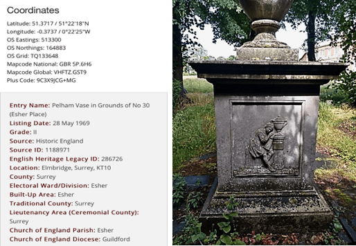 Please note that the current Historic England description states a height of 15ft whilst it is more likely to be between 8 -10ft and requires re-assessment and at the same time the title of ‘vase’ should perhaps be more accurately amended to urn.