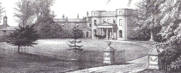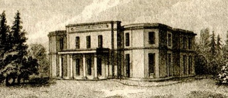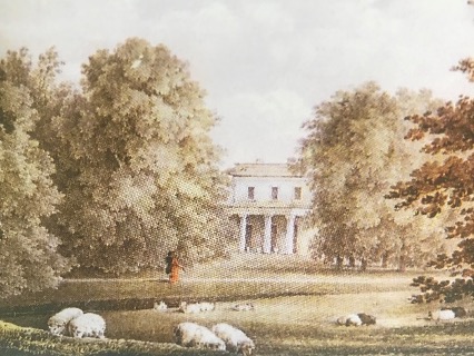 This is the description of Esher Place that accompanies the above 1828 coloured engraving by George Prosser. “The building is of irregular form… An elegant Ionic portico ornaments the central division of the house, and on each side are circular wings, which greatly contribute to the picturesque effect of the building. The South front is similar in its arrangements, excepting that the portico has the addition of a pediment, and the whole of this front has a greater elevation… The interior comprises; a spacious entrance hall; a dining-room of excellent proportions, with a drawing-room, a library, and dressing rooms. There are several good paintings; amongst which is a portrait of Charles II, when Prince of Wales, by Vandyke; the Philosopher’s, by Jordaens, &c. The whole building is stuccoed, in imitation of stone, and is shewn in fine relief by the surrounding foliage. Connected with the South-west wing are offices: to the westward is the conservatory, and on the other side of the park is the kitchen garden. The Gate-house, as seen in approaching the new mansion, forms a striking and very picturesque object, clad as it now is, with ivy, and surrounded by majestic trees, which form a leading feature in the embellishments of this charming retreat…”