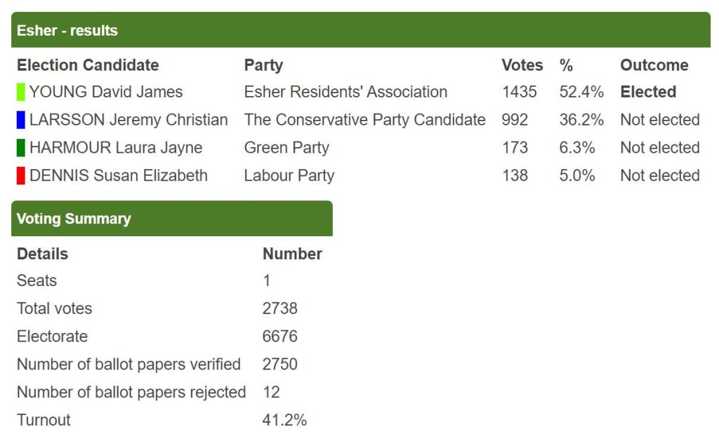 Now the hard work begins. I look forward to representing you in the Council and continuing to talk to you about our local issues and how we can protect and improve Esher and Hersham.