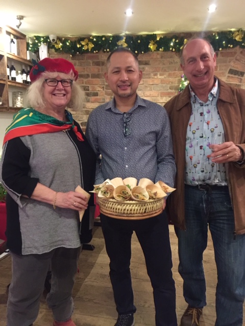 Chairman of Esher Residents Association, Simon Leifer, pictured with his wife Joan and Tom the Manager of The Giggling Squid, at a seasonal drinks and nibbles event.