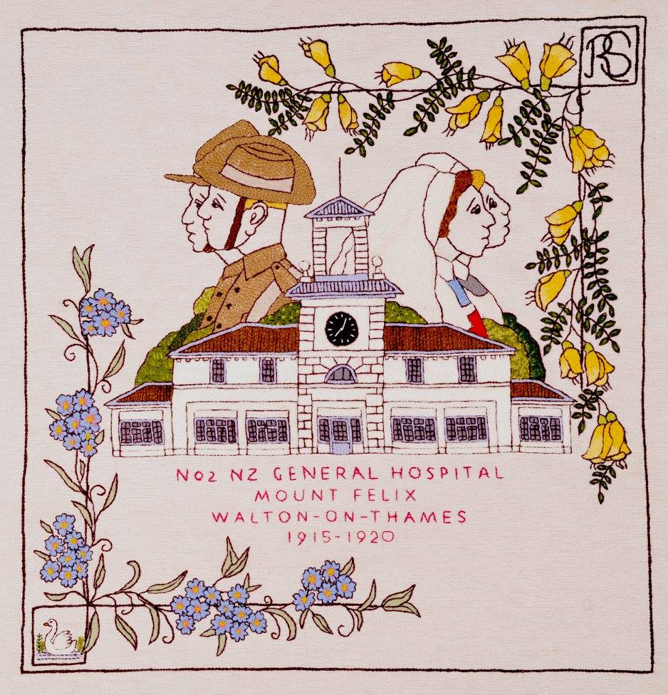 “This beautiful community tapestry tells the story the ANZAC hospital at Mount Felix in Walton on Thames. 27,000 New Zealand wounded soldiers were welcomed into the heart of Walton on Thames and treated at this hospital during WWI and Andrew Crummy’s design depicts some of the most powerful true life stories surrounding the hospital in 44 panels. This tapestry toured New Zealand 2018 to 2019, finishing in The National War Museum”.
