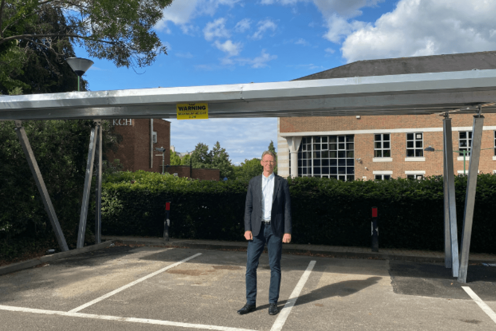 Elmbridge Borough Council has recently installed a solar panel car port in the Civic Centre car park. This is a trial to see how car ports can work in our car parks. Depending on its success, further car ports may be installed here and in other locations.