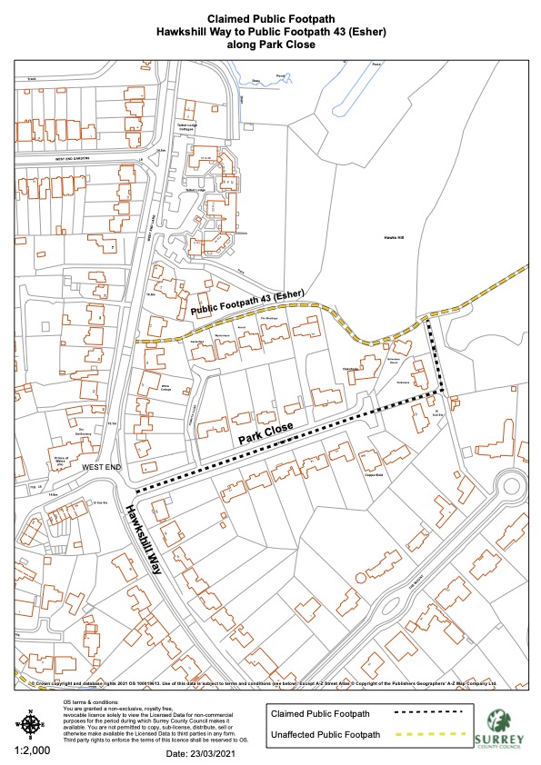 SurreyCC. reviewing ‘alleged public footpath from Hawkshill Way, along Park Close to join Public Footpath 43 (Esher)’.